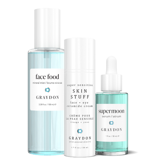 Face Food Mineral Mist helps to hydrate the skin with white tea. A few drops of Supermoon Serum help to hydrate the skin with vegan hyaluronic acid...